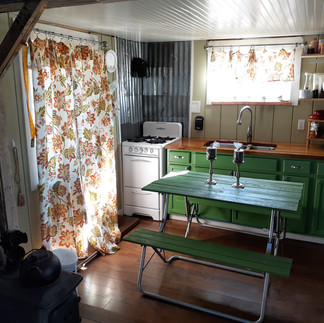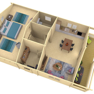 Also in the Great Room we will be adding banquette seating which will double as a L shaped sectional sofa and will also include a full sized fold out platform on which we can put an air mattress and use as a bed for guests. I recently purchased a drop leaf table so I can pull out the table to sit in front of the banquette when we have quests, either to dine or play cards, games etc. We will put our TV on a wall mount with an articulating arm so it can be seen from the kitchen or living/dining areas. Again to make ease of the electrical work with the log structure, all of our outlets will be on the exterior walls. We will have a 6ft fan in the center of the room, led can lighting and several chandeliers from the ceiling to provide LED lighting throughout. The small cabinets in the island are just there as placeholders.. as we have not decided if we will have cabinets or open shelves below, as well as the wall of cabinets behind the entry door. We actually have a hoosier cabinet that we plan to put there so I just used cabinets which were in the kitchen planner to make a "placeholder" for the space to see if it will work or not. We used masking tape on the floors to be able to envision the cupboards and other large pieces on the floor space. We will utilize some bark beetle live edge shelves in place of upper cabinets as well. I think upper cabinets tend to close the space in and in an already small kitchen I think it will be the best idea, especially since we will have a 12x12 storage area under the loft.